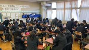 生徒たちは班を作って熱心に調べていました。各班にリーダーシップをとれるような生徒もいて、よくまとめてくれていました。最近は200台以上のパソコンが学校で使える状況になったため、多くの生徒がパソコンを使って作業しています。パソコンまたはスマホからスライドを編集しています。熱心に、楽しそうに活動していて、とても嬉しく思いました。