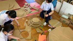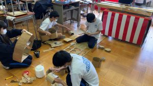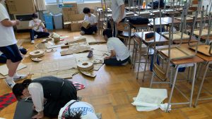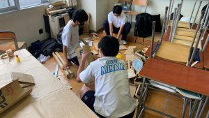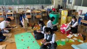山梨県立甲府南高等学校 > お知らせ > 保護者の皆様へ > 3学年の保護者の皆様へ(緑陽祭準備風景) 2022年6月11日カテゴリー: お知らせ 保護者の皆様へ 3学年の保護者の皆様へ(緑陽祭準備風景) 6/11(土) 今日は朝一からどのクラスも作業が始まっており、大勢の生徒がクラス参加企画の準備や造形の製作、似顔絵づくり、クラスうちわづくりなどに精を出していました。とても丁寧に作業していますが、完成が間に合うかどうか微妙な状況のクラスもあり、今日と明日で急ピッチに作業が進むのではないかと思います。また、私自身は休日に生徒と触れ合えて楽しい時間であるとともに、こうやって仲間とワイワイしながら楽しい時間を共有できる高校生がうらやましくも思います。貴重な時間を満喫してほしいと思います。 学園祭期間ではありますが、今日は複数の部活動の生徒が大会に参加しています。3年生で出場している生徒は、ほとんどの生徒にとって最後の大会になるようです。1つでも多く勝ち上がっていくことを祈っています。 (文責 佐藤慶)