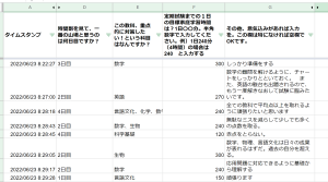今回のフォームアンケートではその場で学年全員の生徒の回答を共有して見ることを可能としました。紙でのアンケートでは得られない利点です。他の仲間の目標時間やコメントでやる気につながってくれると良いと思います。