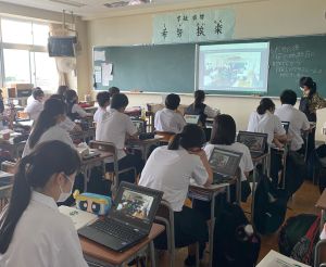 ↓ SSHガイダンスの様子です。黒板の配信を手元のPCでも見ることができます。席が後ろの生徒にとっては便利です。