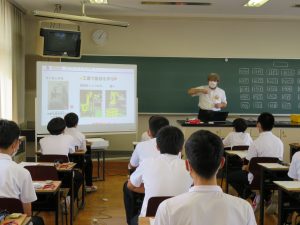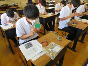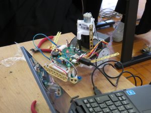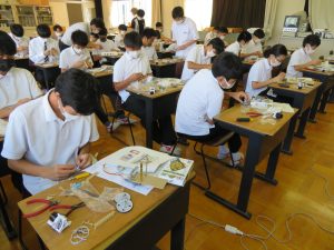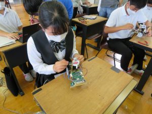 山梨県立甲府南高等学校 > SSH > フロンティア探究Ⅰ「ロボット講座」 2022年9月26日カテゴリー: SSH フロンティア探究Ⅰ「ロボット講座」 9月3,10,17,24日の4回にわたり、1年生30名を対象に「ロボット講座」が開催されました。山梨大学工学部の丹沢先生とTAのご指導のもと、実際に一人一台のロボット作製に取り組みました。主基板やロボットのメカ部分から作製し、プログラムを読み込ませて最終日には、各自が作製したロボットを動かしました。なお、この講座は公開講座として地域連絡協議会の中学生も参加しました。