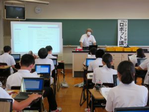 9月3,10,17,24日の4回にわたり、1年生30名を対象に「ロボット講座」が開催されました。山梨大学工学部の丹沢先生とTAのご指導のもと、実際に一人一台のロボット作製に取り組みました。主基板やロボットのメカ部分から作製し、プログラムを読み込ませて最終日には、各自が作製したロボットを動かしました。なお、この講座は公開講座として地域連絡協議会の中学生も参加しました。