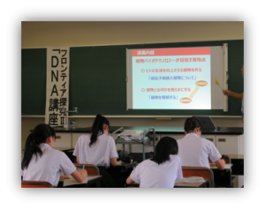 16日は山梨大学教授の鈴木俊二先生をお招きし、農学の視点からDNAをテーマに講義をしていただきました。身近な花の色の品種改良の話から最新の遺伝子組み換えやその倫理的な問題点まで、基本的な知識から今後の起こりうる状況に対してどのように考えていくべきかなどの示唆に富んだお話をしていただきました。