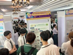 4月26日から30日までタイのシルパコーン大学で開催されている「第16回SCIUS学術フォーラム(主催地:タイ)」に物質化学部の代表として3名が参加しています。物質化学部では3年生を中心にスライムを用いて性能を向上させた「スライム太陽電池」の発電の仕組みについて3年間にわたり研究を重ねてきました。フォーラムではこの研究成果についてポスター発表を行いました。昨日は、コンケン大学附属高校の生徒と交流しながら過ごし、プレゼンも先生方に向かって発表、その後英語で質疑応答と頑張っていました。